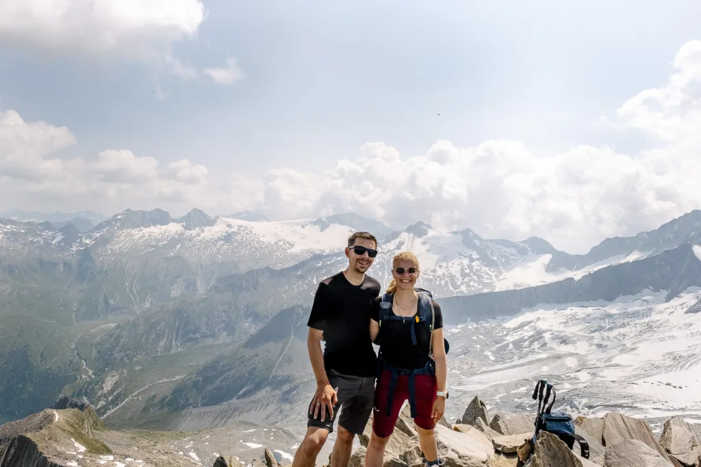 Na een fijne nacht in de Berliner Hütte vertrekken we weer redelijk op tijd. We vertrekken later dan dat we normaal zouden doen omdat we merken dat we de etappes vrij snel afleggen. We willen ook niet te vroeg bij de volgende hut zijn dus doen het in de ochtend wat rustiger aan. Ook vandaag staat er weer veel klimmen op het programma. Zelfs op een ladder van een meter of 10. De route is minder zigzaggend dan gisteren, maar het laatste stuk is vrij technisch. Nu klimmen wij veel en zijn het terrein gewend, maar het verkeer gaat twee kanten op. Hierdoor moeten we dus regelmatig om mensen heen stappen die zich bezorgd vastklampen aan de kabel. De inspanning is niet voor niets, want vandaag komen we op de hoogste top van de route: de Schönbichler Horn (3132m). Ook hier heb je een prachtig uitzicht op de gletsjers om je heen. We doen ons top dansje en beginnen daarna aan de afdaling. De route gaat eerst veel door sneeuwvelden en daarna volgen we een goed aangelegd pad. Ondanks dat we later vertrokken zijn we toch met lunchtijd bij de hut. We bestellen een broodje en hebben een middag waarin we veel verhalen wisselen met andere hikers die we deze week hebben leren kennen.