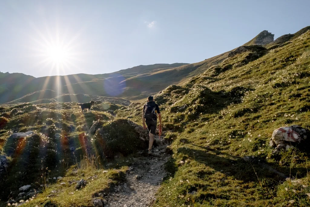 Het begin van de wandeling loopt over eenvoudige bergpaadjes, maar al snel slaan we af naar een wat steiler stuk met veel gruis en bosjes. Met dit korte klimmetje komen we steeds dichter bij de majestueuze pas. En ook wordt het wandelpad hier weer een stuk makkelijker. We wandelen over een prachtige alm en Bruno heeft de tijd van zijn leven. De paden zijn goed onderhouden en we zijn hier helemaal alleen. De kabelbaan die aan de andere kant van de berg zit is namelijk net gesloten en alle dagjesmensen zijn weer naar beneden gegaan. Wij lopen daarentegen nog verder omhoog naar de top van de Widdersberg.
