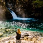 Bij het eindpunt is een klein restaurantje en omdat we in een uur door de Vintgar kloof zijn gelopen is het een mooie tijd en een mooie plek voor koffie. Bij dit eindpunt vind je ook de Slap Šum waterval. Dit is een waterval van 16 meter hoog. Je kan deze van bovenaf bekijken door een brug die er overheen ligt en je kan deze ook vanaf onderen bewonderen door een stukje verder af te dalen. Wij besluiten beide te doen en dalen af om de waterval van dichterbij te bekijken. Het is een mooie waterval en voor Bruno is het de ideale gelegenheid om even af te koelen in het water!